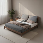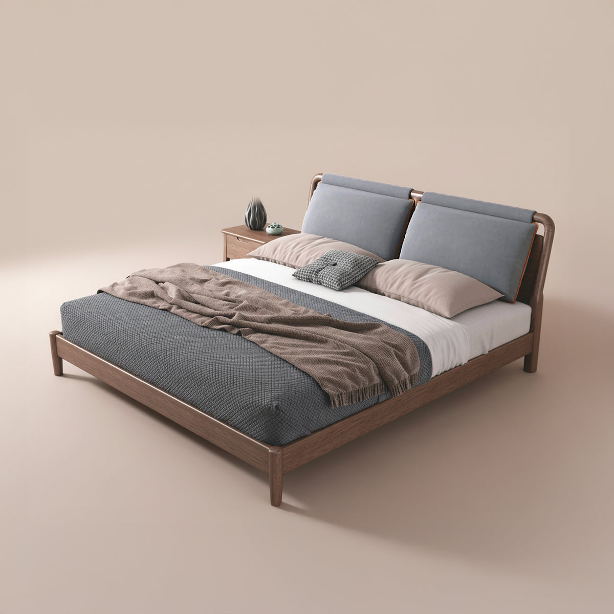 Its rich, solid walnut frame and plush blue headboard cushions combine to create a harmonious retreat — modern, tranquil, and effortlessly chic.