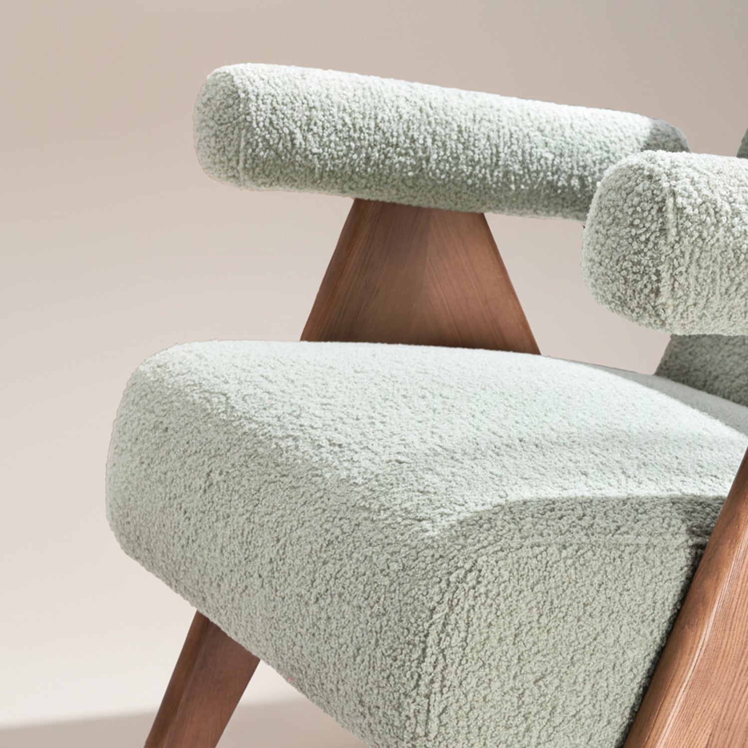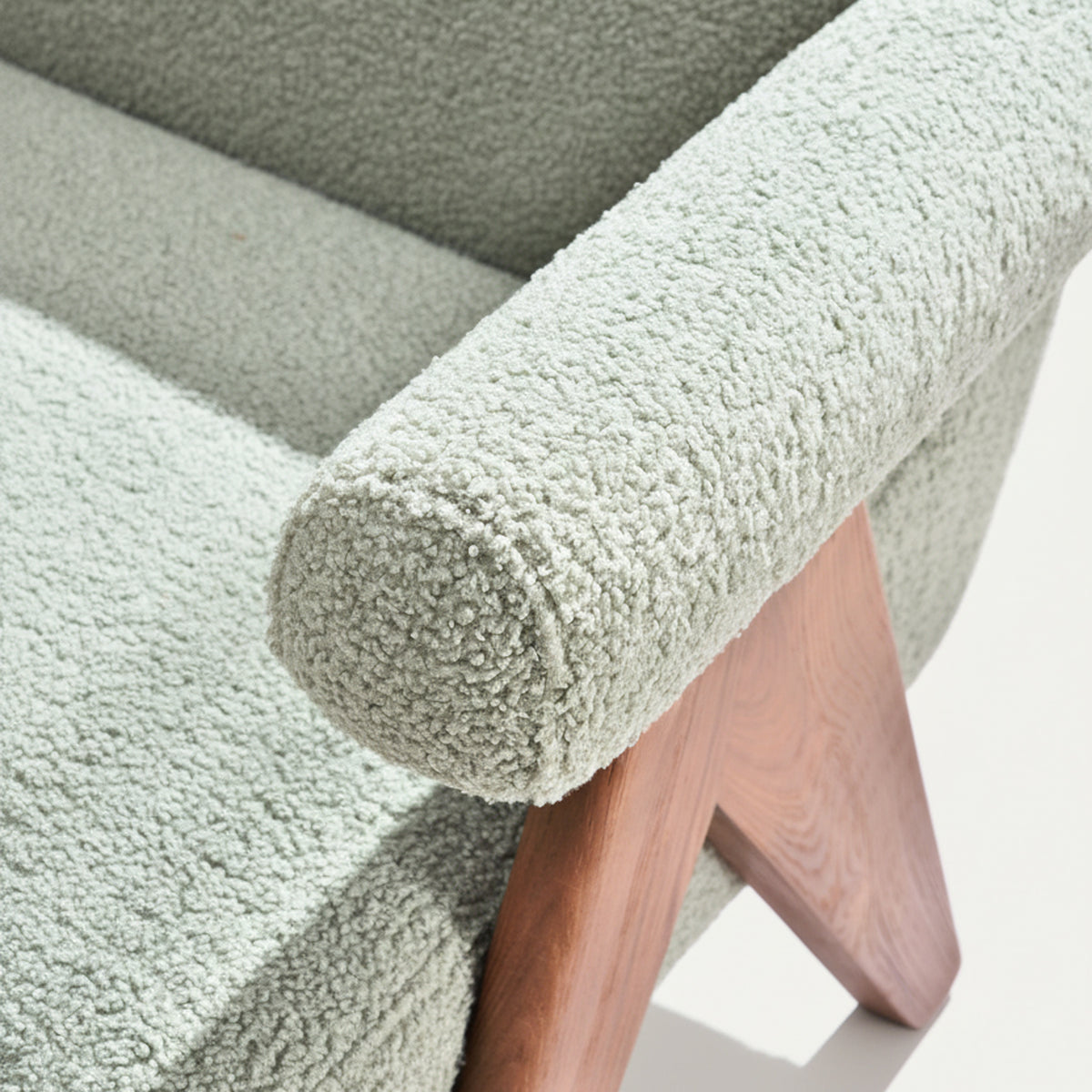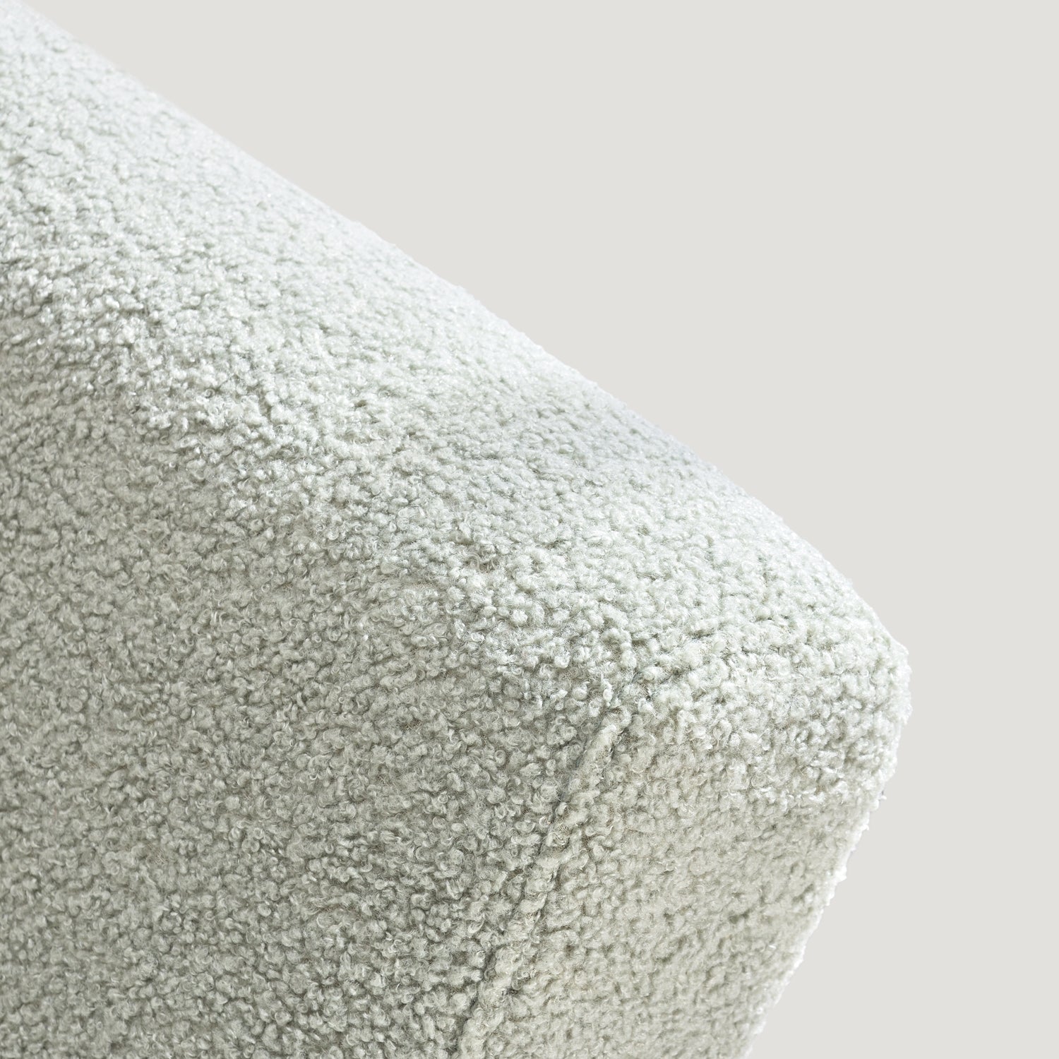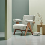 Plush Bouclé Fabric: Upholstered in a calming, tactile bouclé, this chair offers an incredibly cozy texture that introduces a sense of peace and organic elegance.