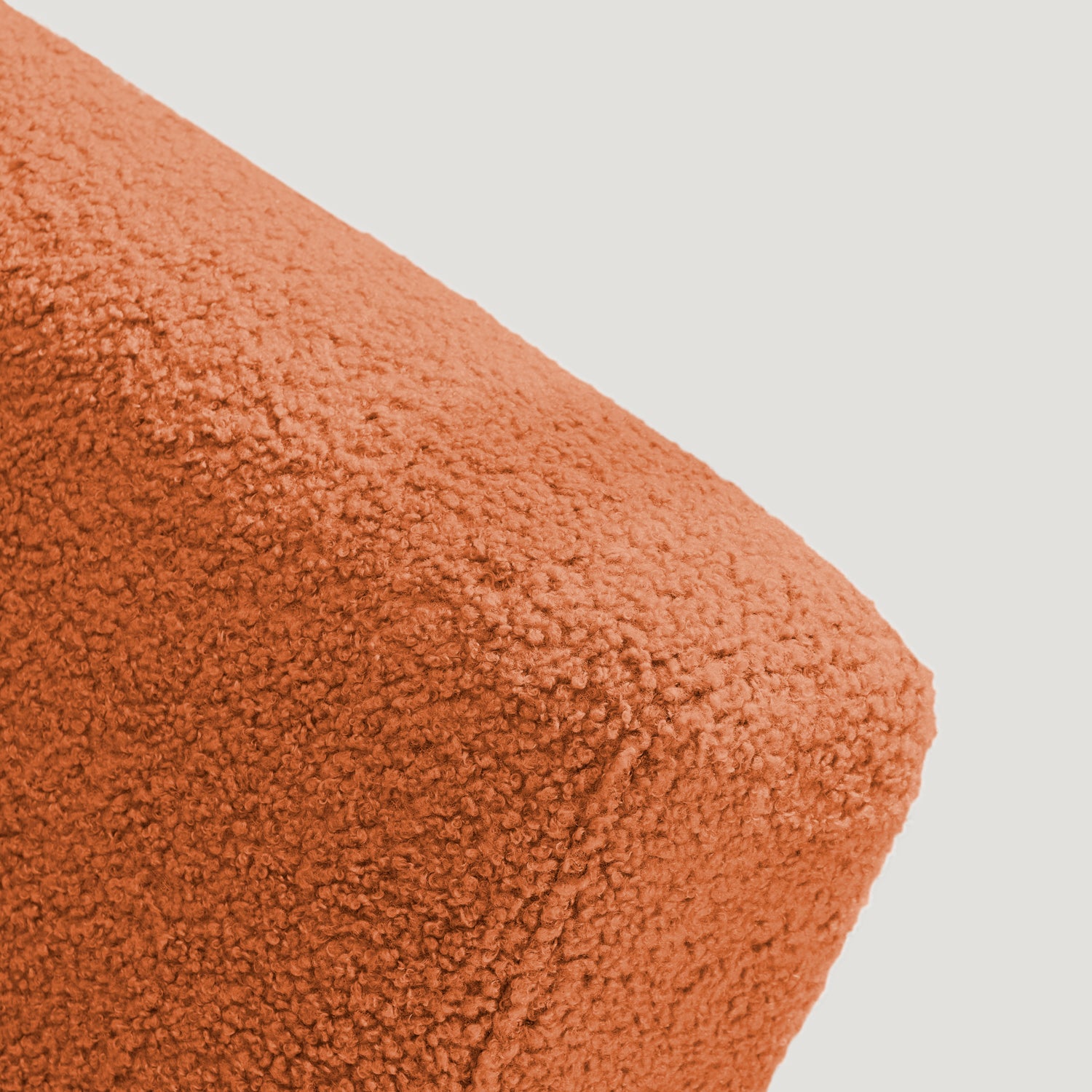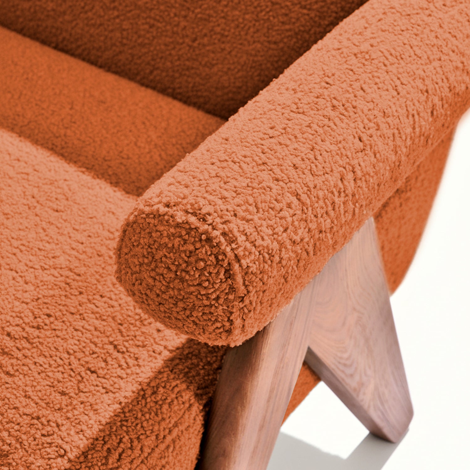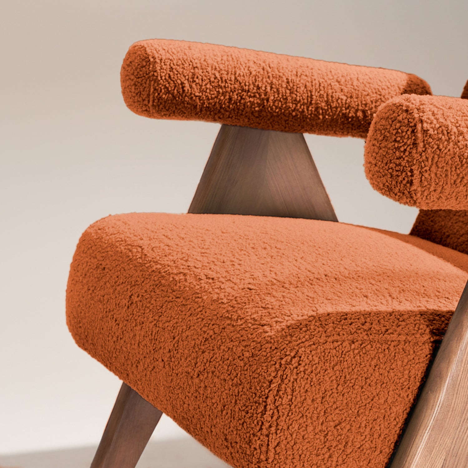The Milo Armchair in Burnt Orange invites you to settle into its vibrant character and timeless design. Its irresistibly soft bouclé fabric and warm-toned solid wood frame come together to create a silhouette that is both playful and sophisticated—a statement piece that radiates comfort.