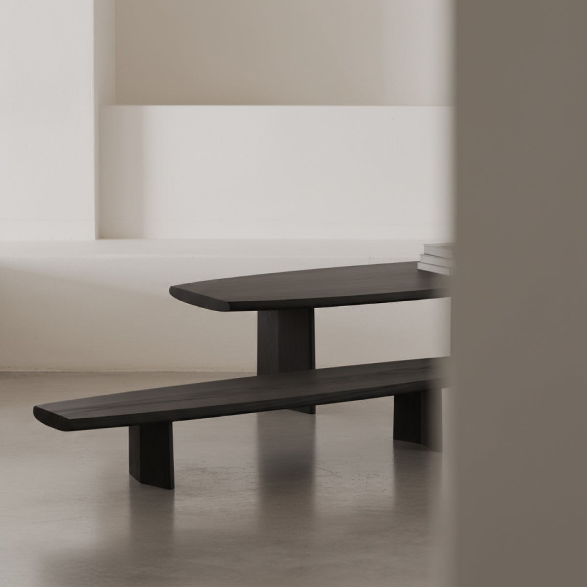 The Umbra Hight Coffee Table in Black is a striking piece that blends sculptural artistry with functional design. Crafted from richly textured black wood, its distinctive elongated, curved silhouette creates a captivating centerpiece in any living room. Perfect as a modern coffee table, a unique low bench, or an intriguing decorative accent, it adds a touch of bold, minimalist elegance to your space.